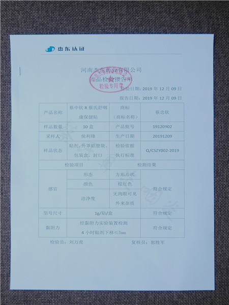 蔡氏舒咽康保健貼檢驗(yàn)報(bào)告